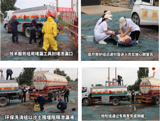 演練以“危貨車輛介質泄漏”及“輪胎著火”兩個事故為模擬事故場景,圍繞“事故發生—應急響應—科學處置”全流程展開,突出“事故初期處置、傷員急救、泄漏封堵與倒罐、火災撲救、環保洗消、后勤保障”等六個關鍵環節的應急處置與演練,全程緊張有序,參演人員配合默契,充分展現了石家莊市危貨運輸企業的實戰水平和協作效能。